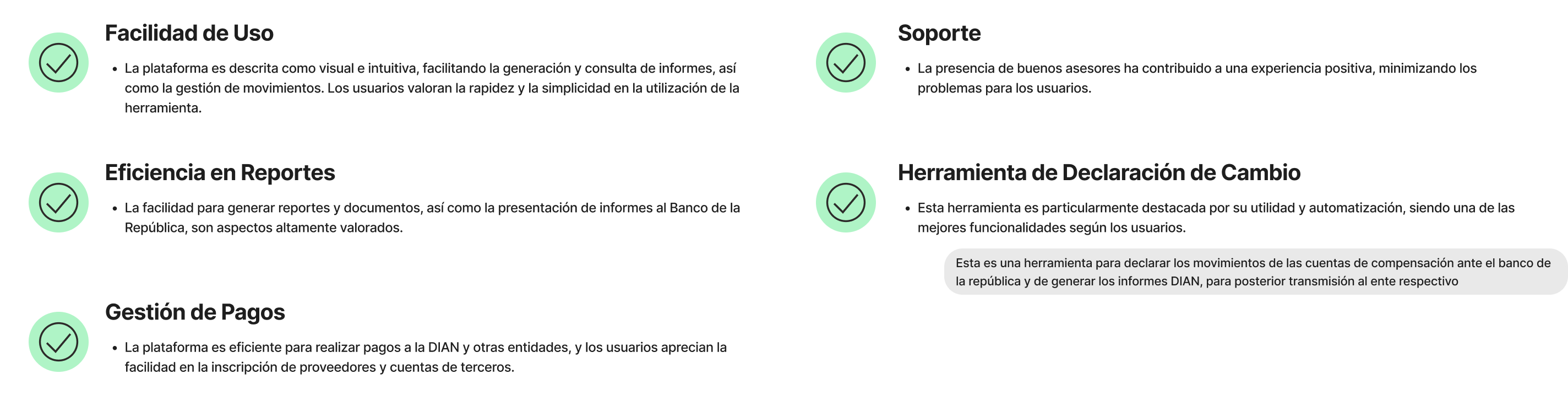 Los comentarios positivos destacan que la plataforma es intuitiva, visual y fácil de usar, permitiendo a los usuarios realizar tareas como la generación de informes, pagos a proveedores, y la gestión de movimientos de manera rápida y eficiente. En general, la plataforma es vista como útil, rápida y confiable, con una interfaz amigable y procesos bien organizados