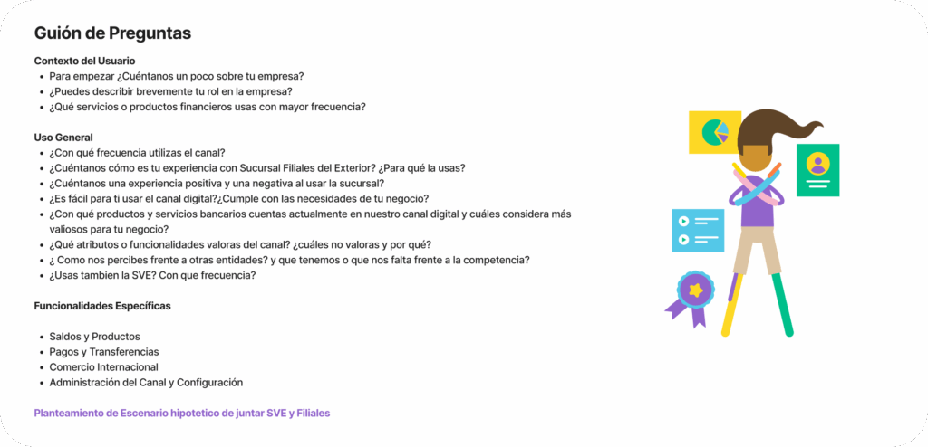 Entrevistas con usuarios seleccionados, utilizando un guion estructurado para guiar la conversación y recopilar información valiosa.