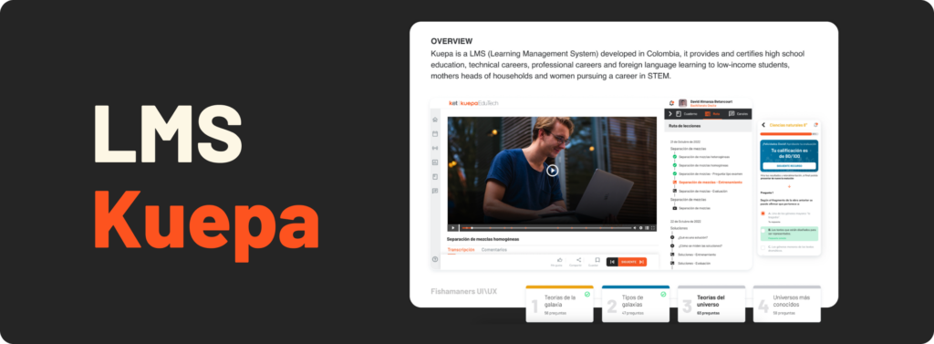 Kuepa es un Sistema de Gestión de Aprendizaje (LMS) desarrollado en Colombia, que brinda educación online, secundaria, técnica y profesional a una comunidad de más de 900 estudiantes en activos.