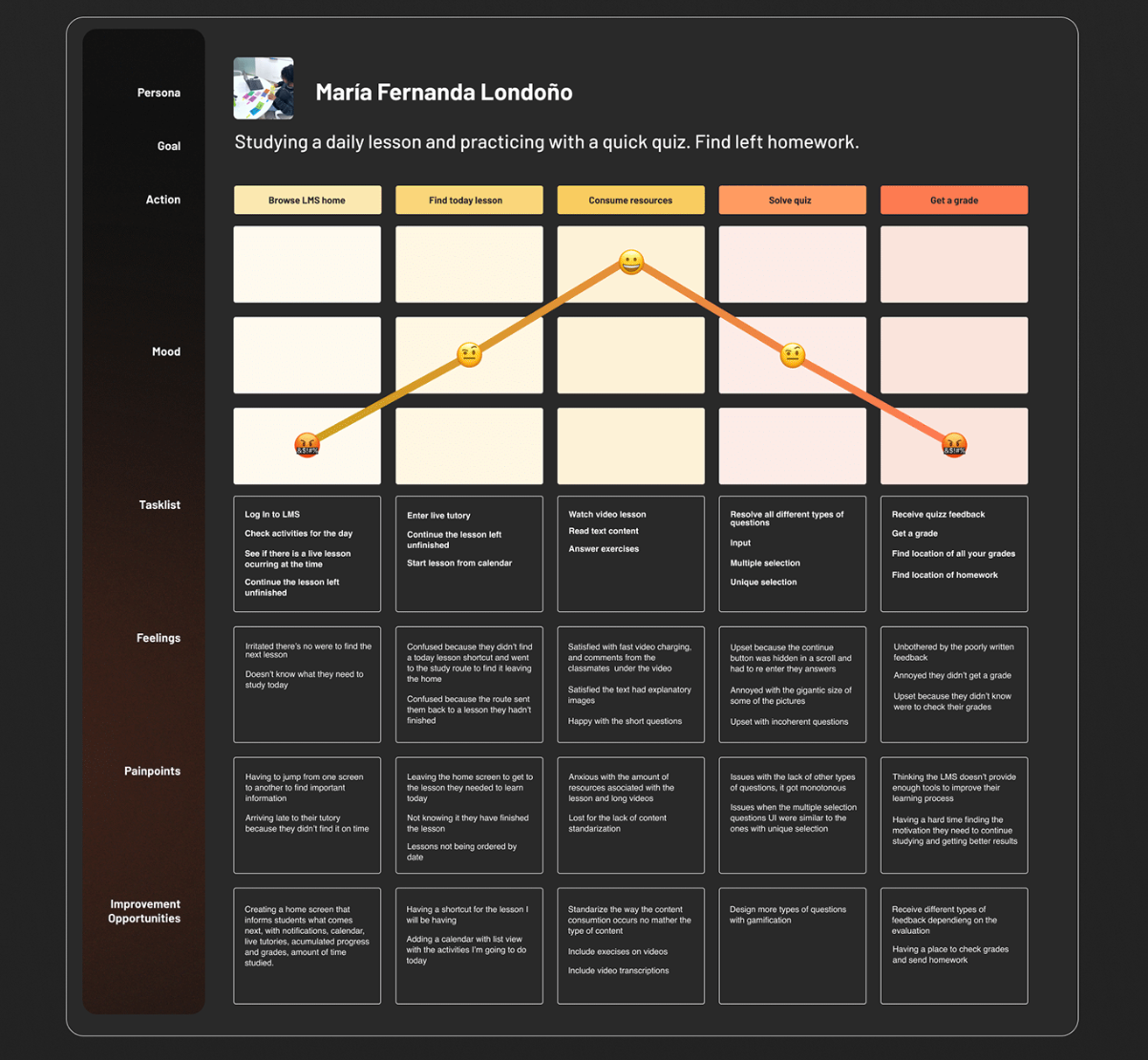 Realizamos un ejercicio moderado con varios estudiantes utilizando la plataforma actual, para descubrir puntos de dolor, sentimientos y oportunidades.